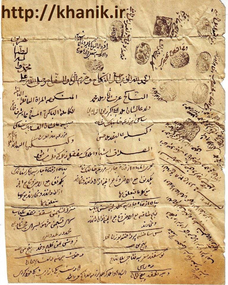 تصویر مقابل سند ازدواج زوجی از خانیک است که در سال 1320 قمری -دوشنبه، ۹ اَمرداد ۱۲۸۴- تنظیم شده است.